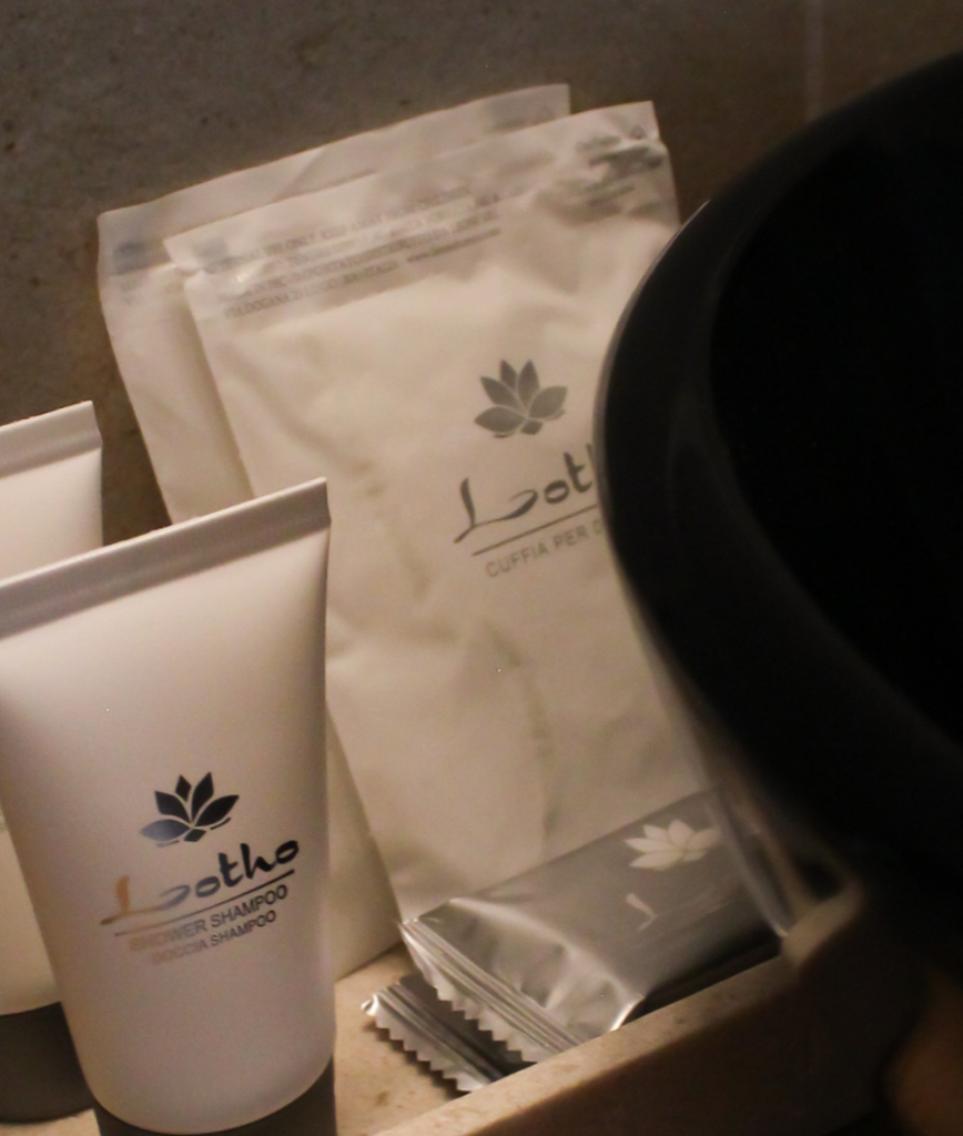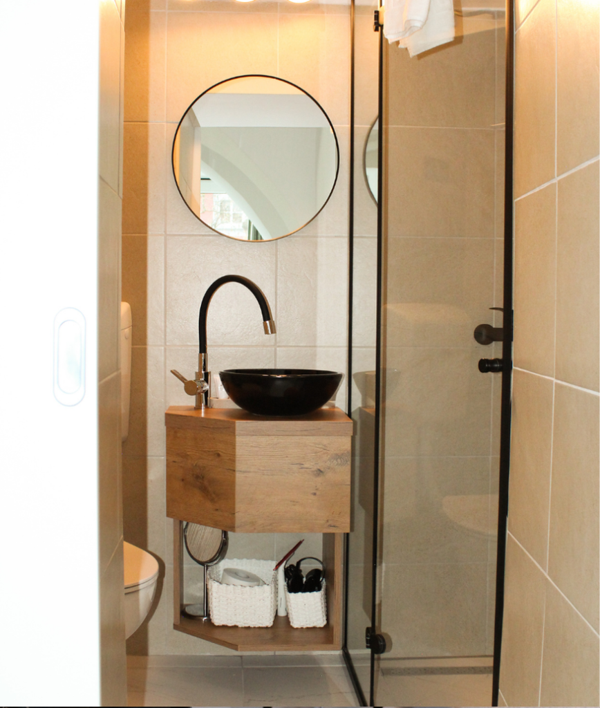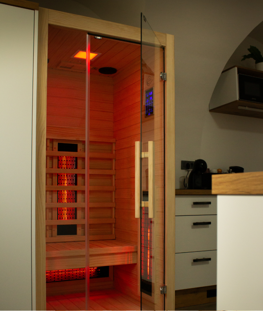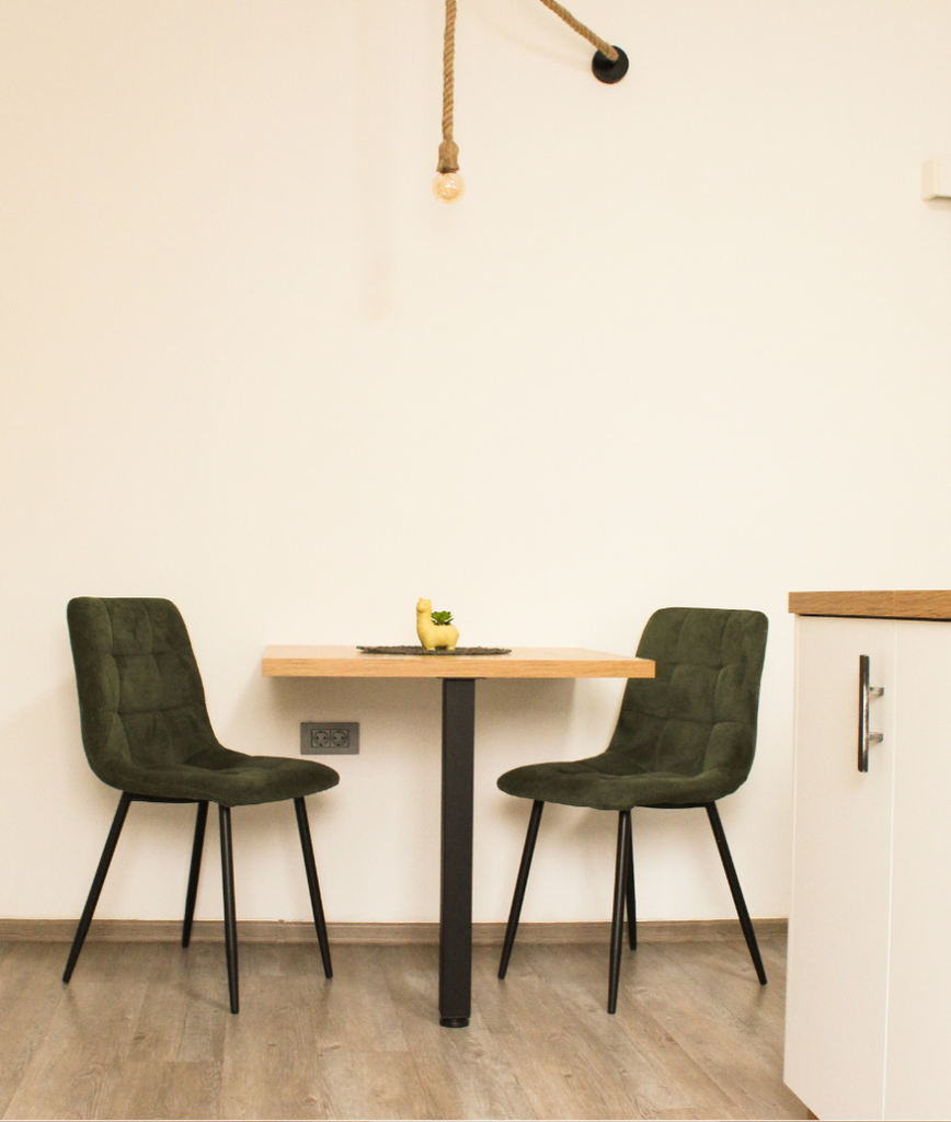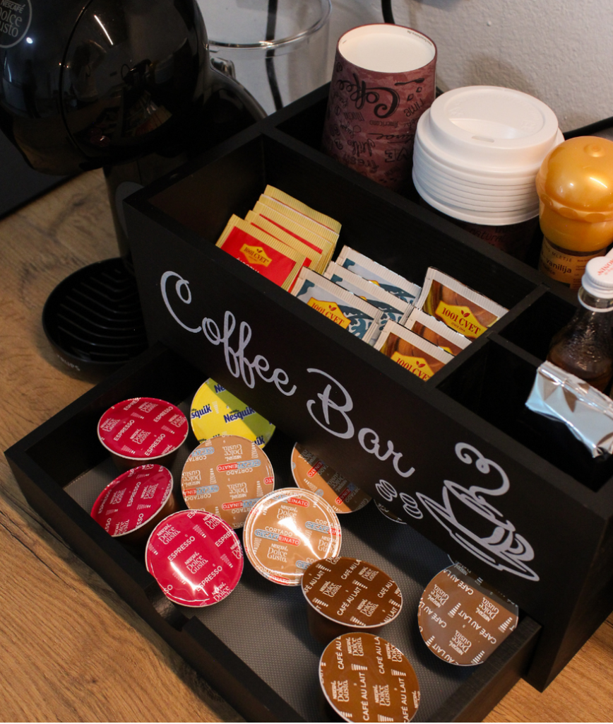 • manjša, funkcionalna kuhinja (grelnik vode, kavni aparat, hladilnik, mikrovalovna pečica, indukcijska plošča, posoda za kuhanje, kozarci, krožniki, pribor)